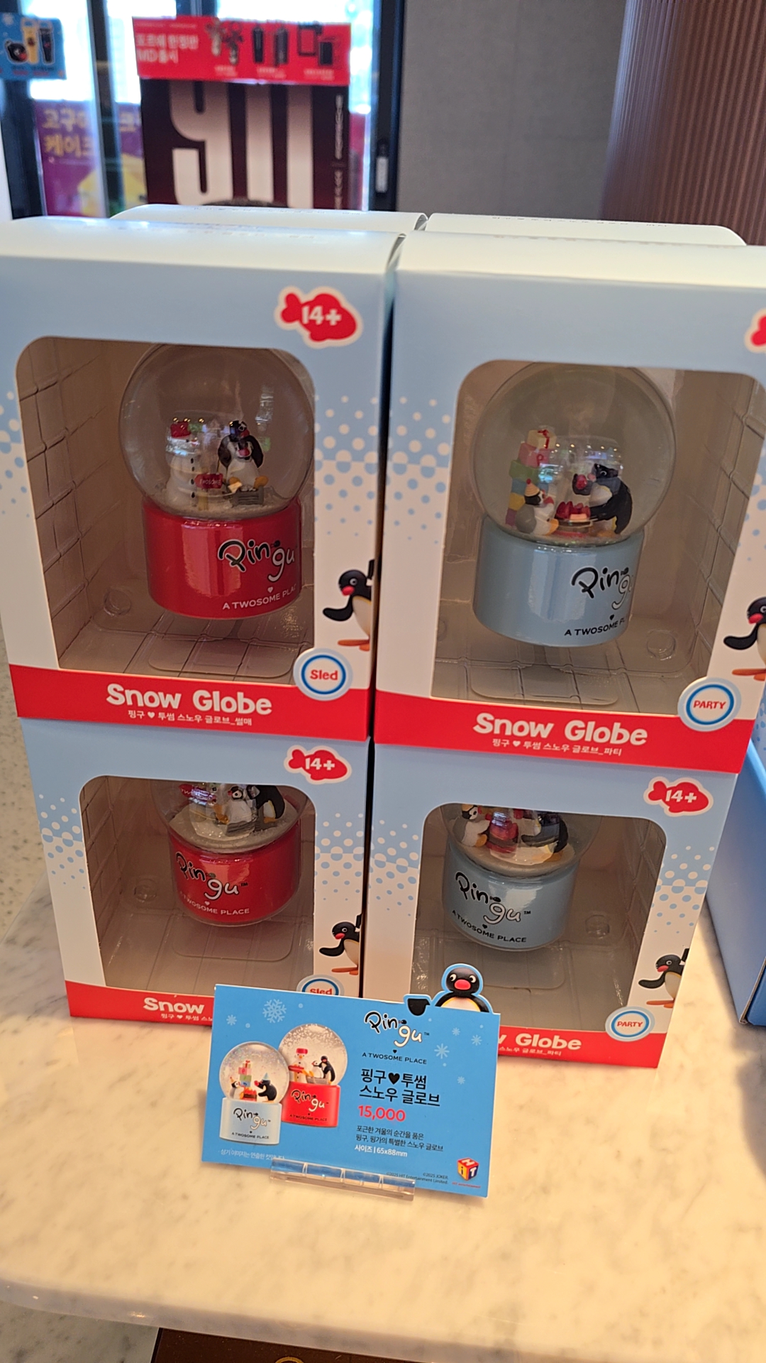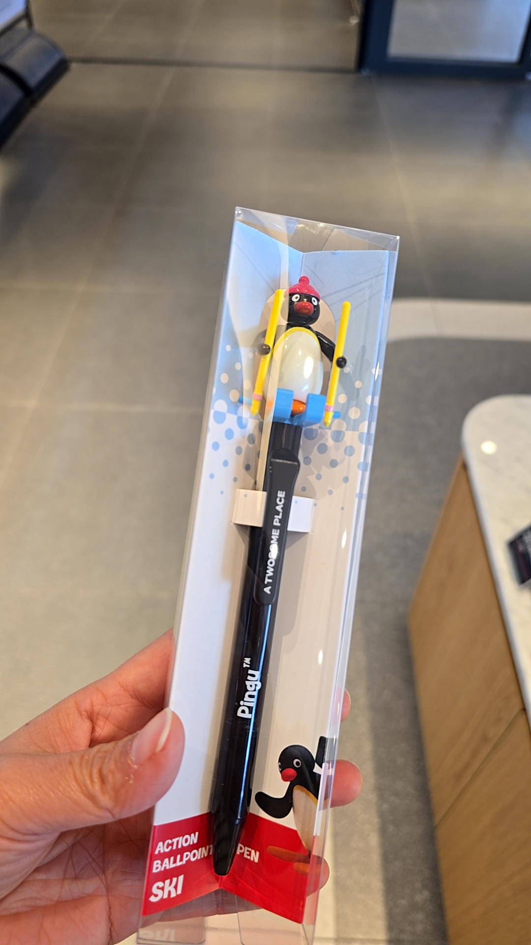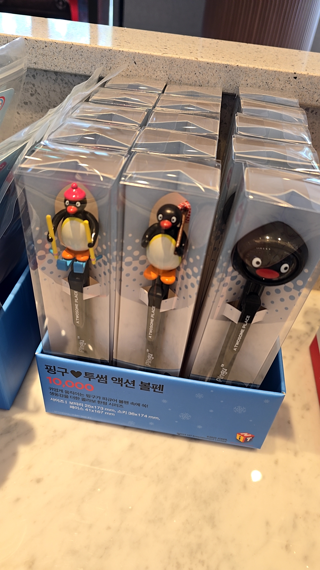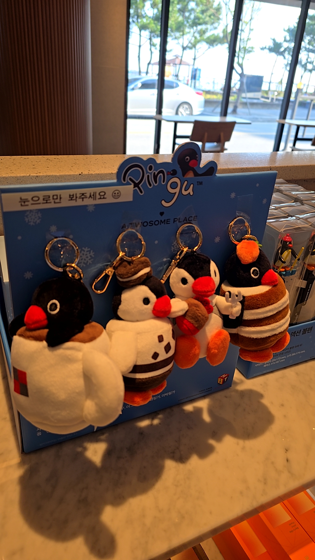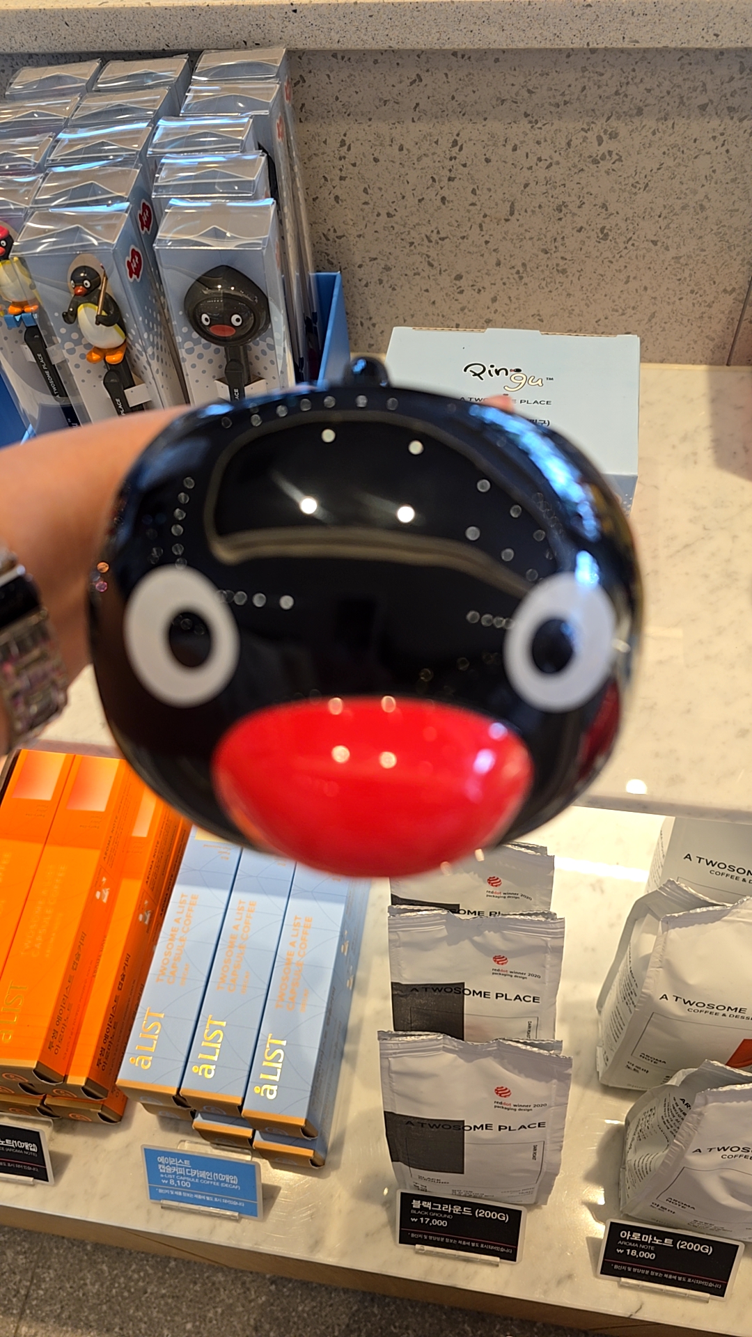 현재 매장에서는 핑구 컵, 볼펜, 인형, 텀블러 등 여러 가지 아이템이 전시 및 판매 중이에요.